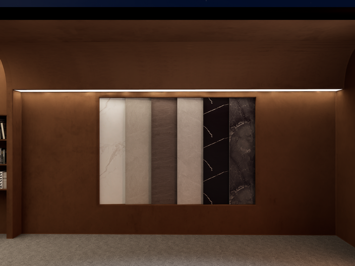 The showroom unfolds as a quiet spatial journey. A dimly lit passage slows the visitor, revealing curated moments of legacy before opening into sculptural stone forms and layered surfaces. Curved walls and sliding panels choreograph light, texture and movement, transforming material into art and exploration into experience.